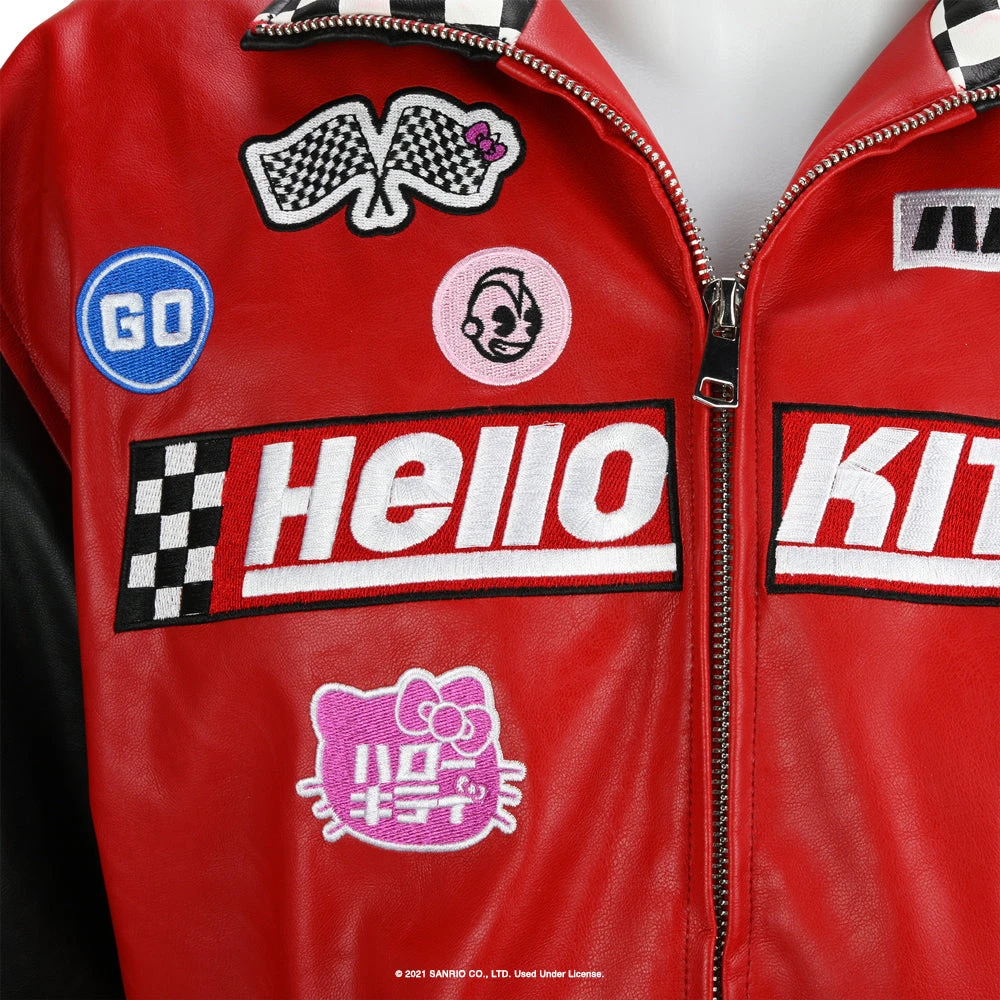 Embroidered patch details, checkerboard racing flag trim, zip front, and back graphics. Flip-up the collar. One inner and two outer pockets.